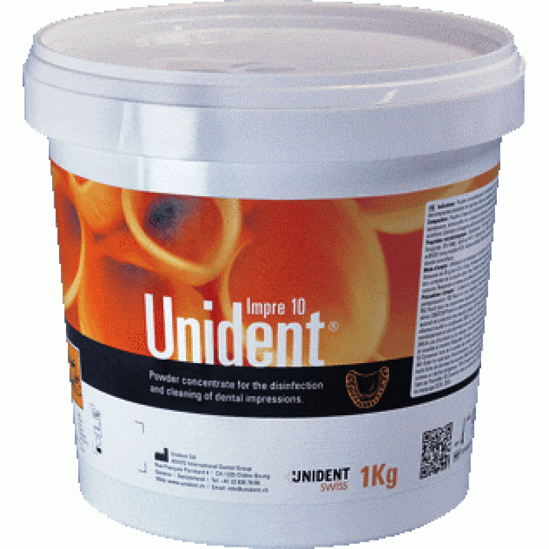 Mükemmek dezenfeksiyon ve temizleme özelliğine sahip, aktif oksijen ve toz bazlı, konsantre bir üründür. Uniden Impre 10 özellikle dental ölçülere, ölçü kalıplarına, takma dişlere, protez cihazlarına vb. yönelik olarak tasarlanmıştır. Ekonomiktir, %2 orannda seyreltilir.